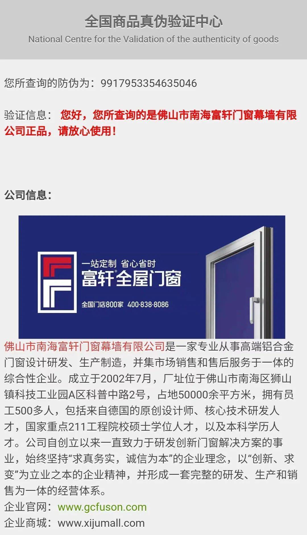 系统自动进入“全国商品真伪验证中心”,扫码后,出现以下正品页面,说明您所购买的富轩全屋门窗产品为正品,请放心使用。