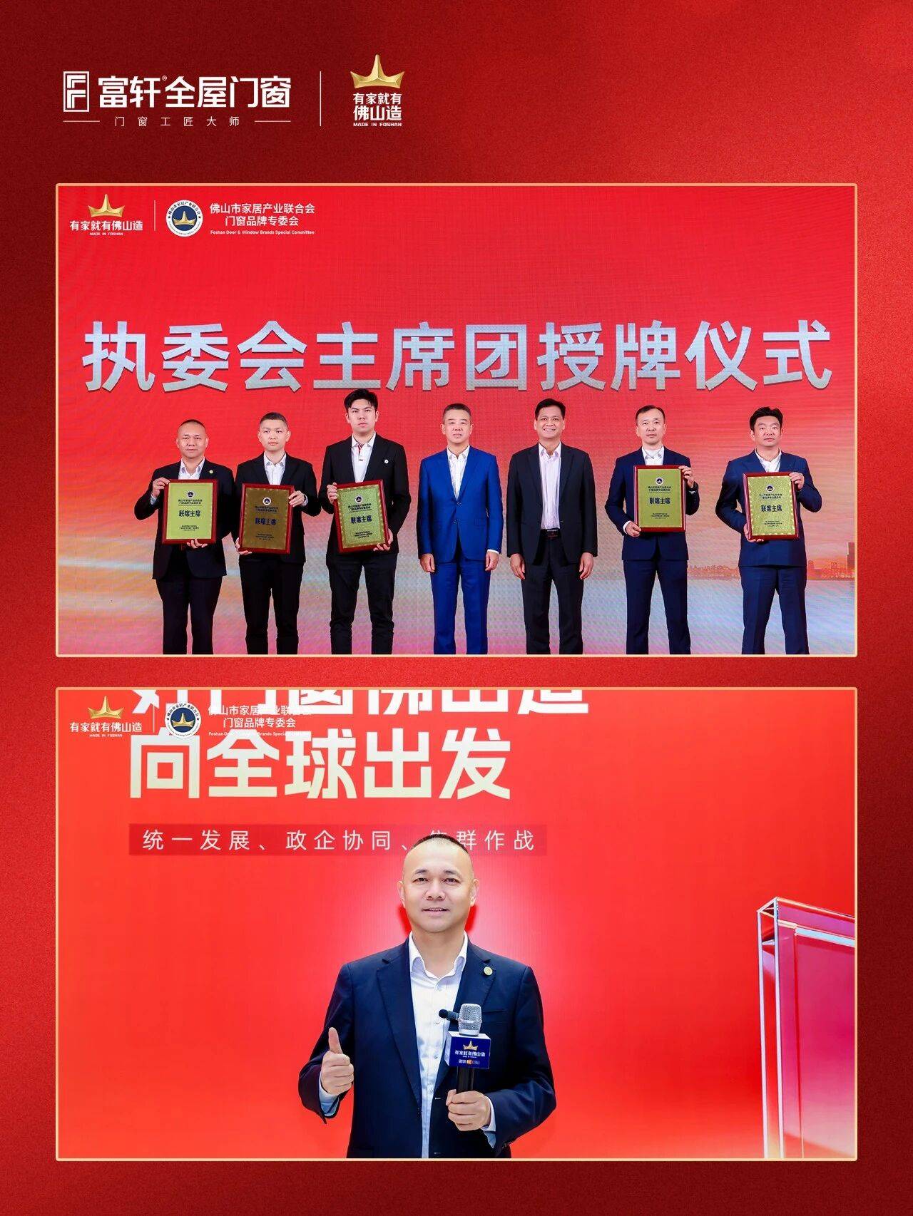大会亮点纷呈,其中由6家佛山门窗头部企业组成的门窗品牌专委会联席主席团授牌仪式尤为引人注目。在这场备受瞩目的仪式中,富轩全屋门窗董事长李昌安凭借卓越的行业影响力与贡献,被授予“佛山市家居产业联合会门窗品牌专业委员会联席主席”称号,这不仅是对他个人能力的高度认可,更是对富轩全屋门窗品牌实力的有力见证。