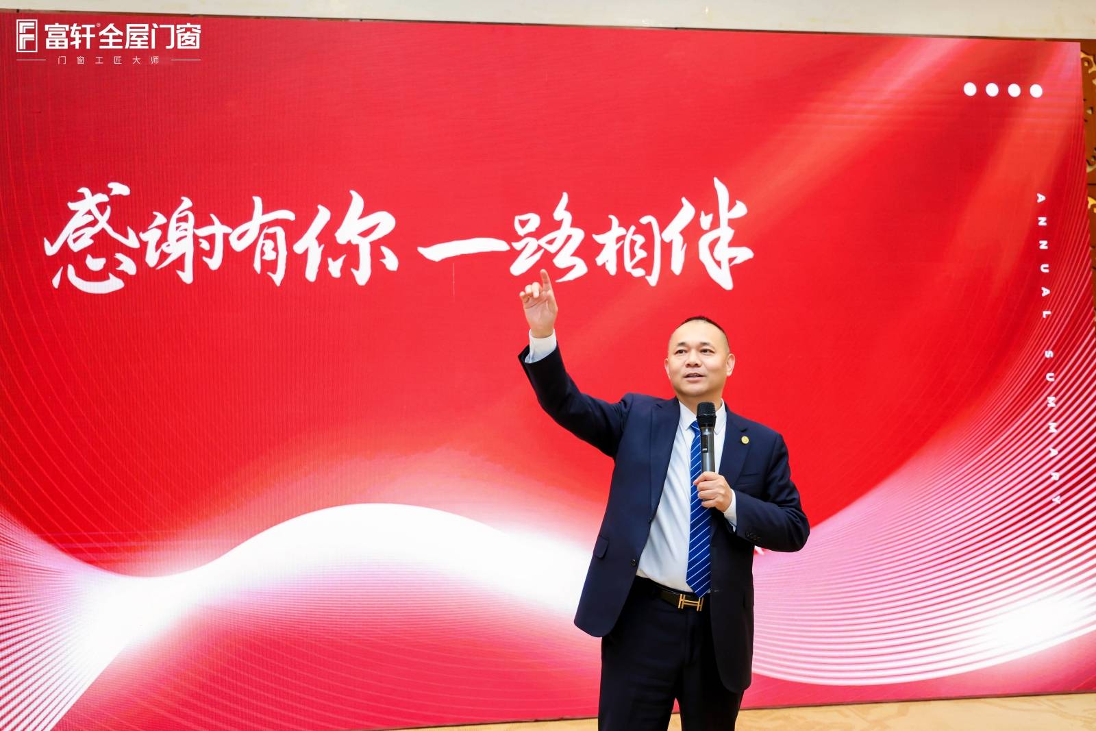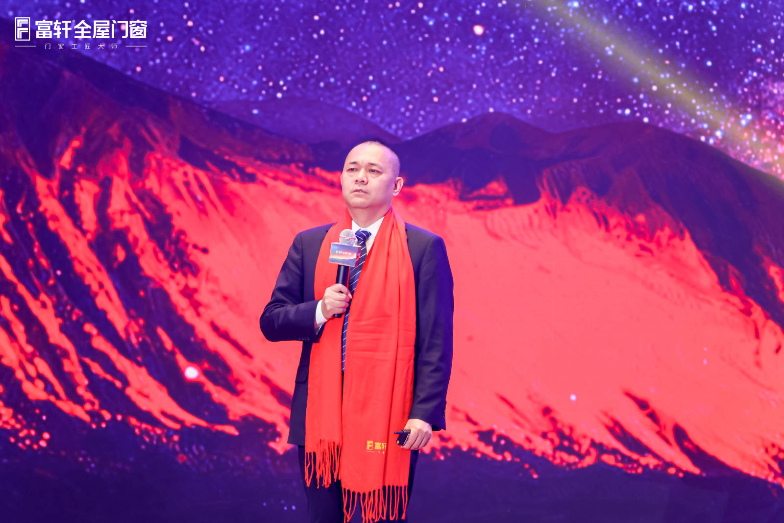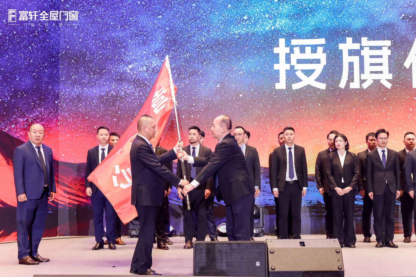 峰会迎来最热血沸腾的誓师环节。在全场瞩目下,富轩集团董事长李董亲手将战旗授予富轩全屋门窗营销总经理翁振晖翁总,旗帜交接间,是信任更是重托;同时带领全国各大战区负责人举行了庄重的2026年度营销中心目标誓师仪式,挺拔的身影不仅展现了磅礴的气势,也彰显了富轩铁军的责任与担当。
