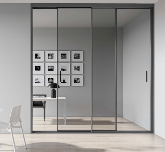 富轩全屋门窗三代极致艺术两轨吊趟推拉门,门扇采用隐藏滑轮斜面结构设计,门扇离轨道/地面仅5mm,微缝视面更简约美观,不容易积灰,易于清洁和打扫卫生。