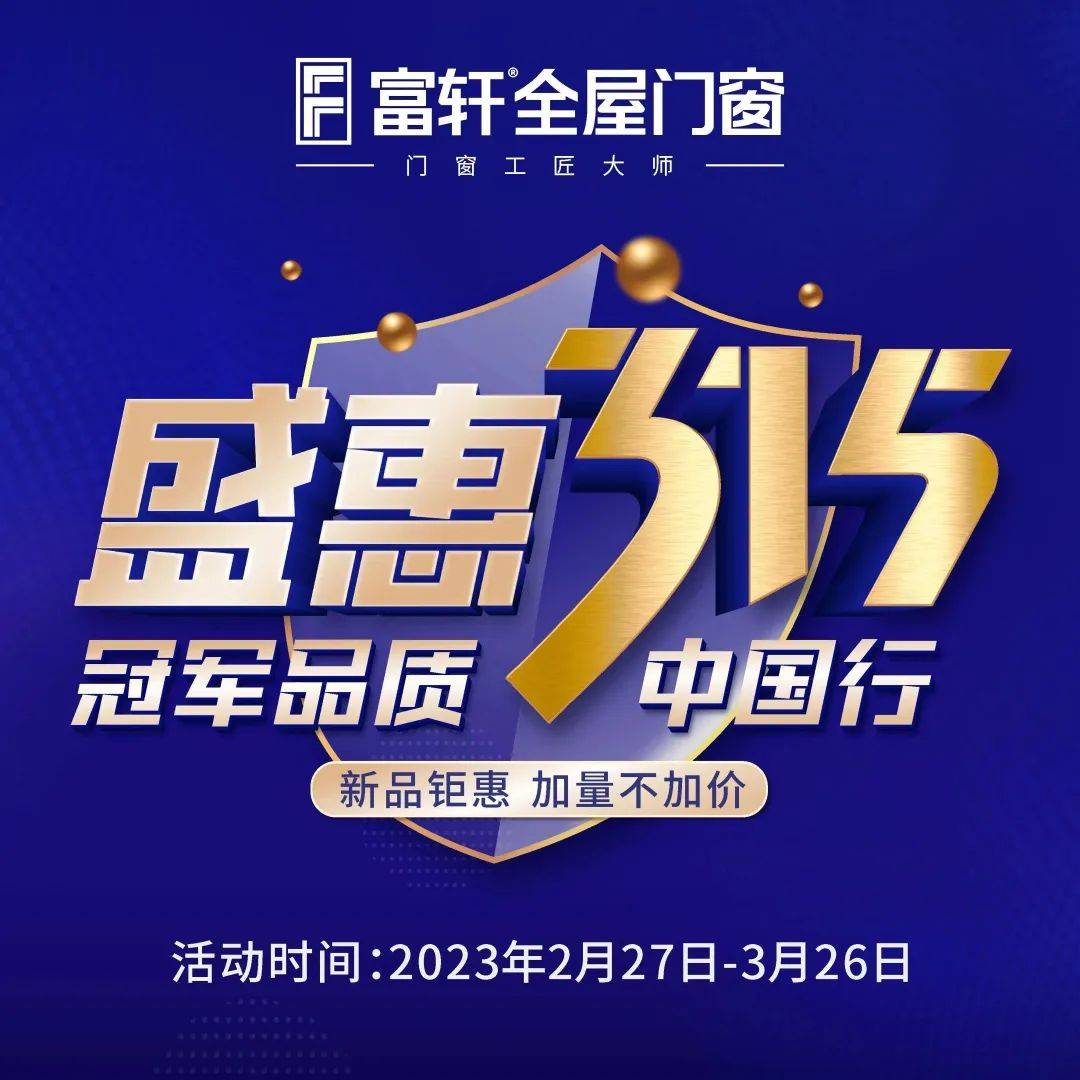 2023年2月27-3月26日,富轩全屋门窗盛惠315活动,欢迎有定制门窗需求的业主朋友进店咨询,活动抽奖、新品钜惠加量不加价、关注富轩抖音号限时获取抖音福利等精彩好礼等你来!